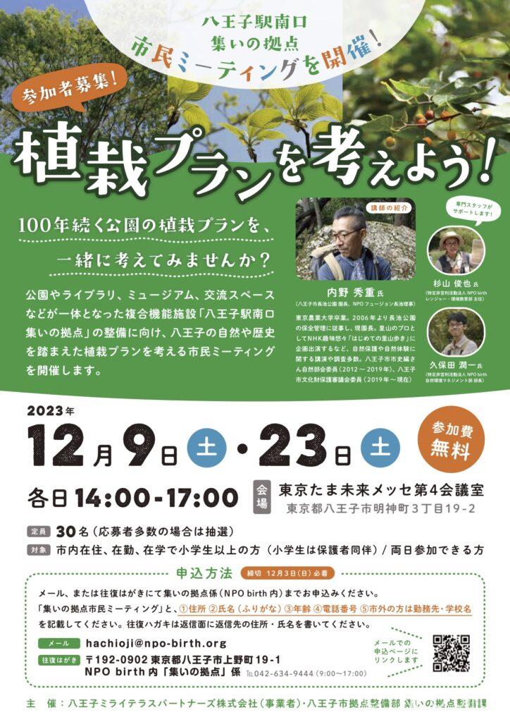 公園やライブラリ、ミュージアム、交流スペースなどが一体となった複合機能施設「八王子駅南口集いの拠点」の整備に向け、八王子の自然や歴史を踏まえた植栽プランを考える市民ミーティングを開催します。